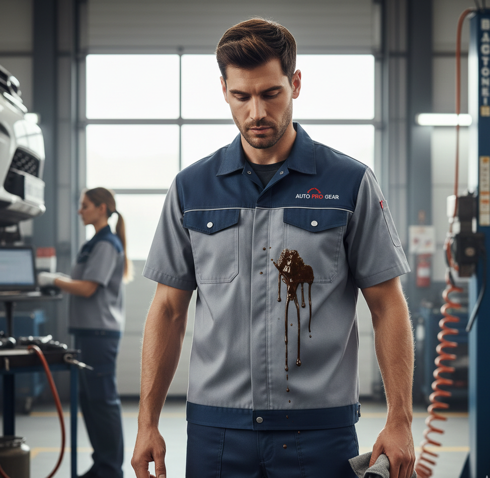 Automotive workshops face uniform issues caused by grease exposure, frequent washing, and high staff movement, making durability and size consistency critical for daily operations.
